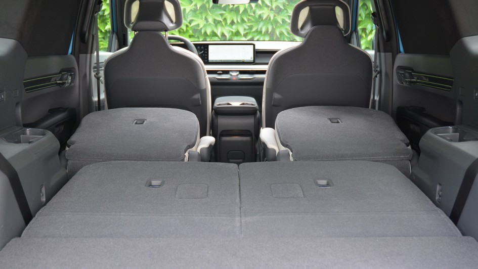 von 12: Die Sitze lassen sich weit verschieben, über zuwenig Platz kann sich niemand beklagen. Der Innenraum verzichtet auf tierische Produkte, die Materialien sind vegan gehalten.
