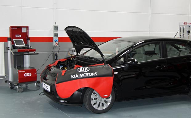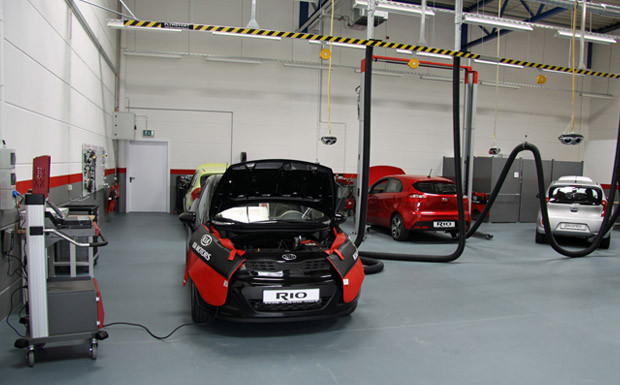 von 6: Sogar die Hebebühne kommt im Kia-Design daher. Das muss aber nicht sein. Bei Exklusivbetrieben ist die Farbgestaltung an den Wänden aber durchaus erwünscht.