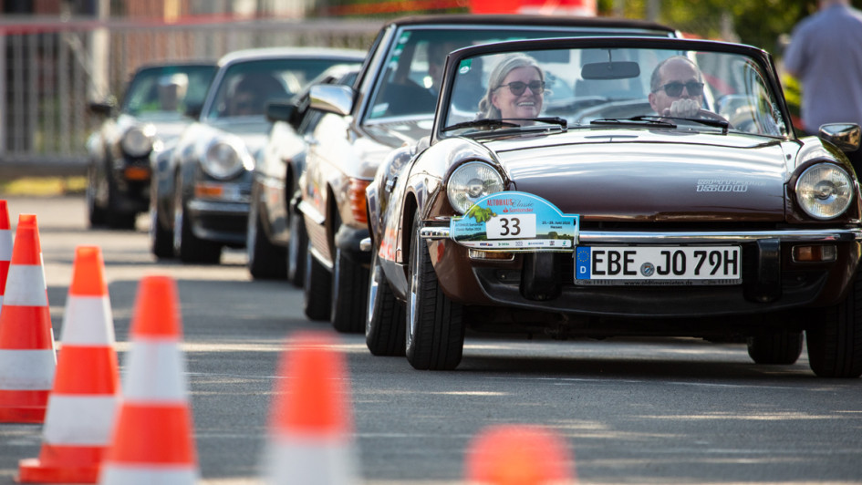 von 14: Am zweiten Tourtag standen die Wertungs- und Gleichmäßigkeitsprüfungen auf dem Segula-Testgelände in Rodgau-Dudenhofen an. Im Bild: Gisela und Wolfgang Melter, Autohaus Melter, in einem seltenen M1.