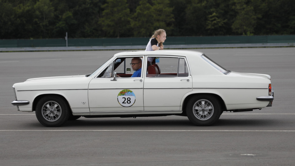 von 14: Einige Beifahrer verwandelten sich mit weit ausgestrecktem Hals in eine "menschlichen Einparkhilfe". So zum Beispiel Lena Kabus, die ihren Vater Jan vom Schiebedach aus unterstützte. Das Team 28 fuhr einen Opel Diplomat B.
