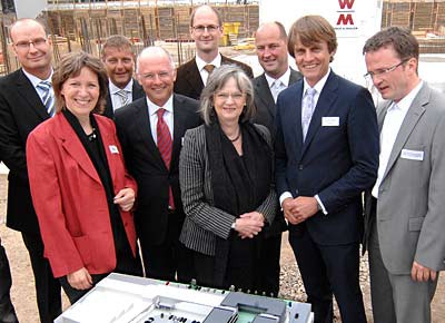 von 4: Bei der Grundsteinlegung am 7. Juni 2010: (vorne v.l.) Birgit Fischer, Vorstandsvorsitzende der Barmer GEK, Jürgen Tauscher, Vorstandsvorsitzender der LUEG AG, Oberbürgermeisterin Dr. Ottilie Scholz, LUEG Vorstand Jörg Scharwald, Architekt Axel Koschany, sowie (hinten v.l.) Thomas Wegener, stellv. Regionalgeschäftsführer der Barmer GEK, Michael Speh, LUEG Centerleiter in Bochum, und die beiden Gesellschafter Stefan und Christian Mahnert-Lueg.