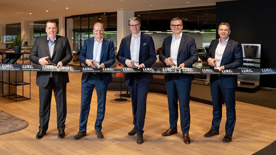 von 8: Das Lueg-Management gab den Startschuss (v.l.): Stefan Jansen (Vorstandsmitglied), Hendric Müller (Geschäftsführer Lueg Solutions), Tim Roderwieser (Spartenleiter Vertrieb Pkw-Gebrauchtwagen), Benjamin Kaiser (Vorstandsmitglied) und Martijn Storm (Vorstandssprecher).