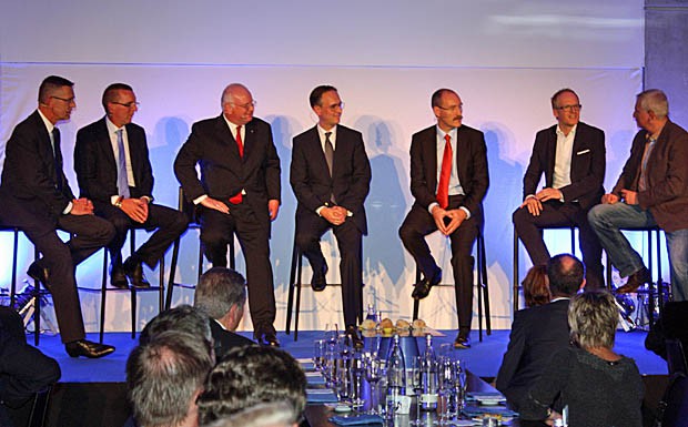 von 19: Stellten das neue Gebäude vor: Michael Fella (Mahag), Henri Strübing (VGRD), Josef Fahle (VW-Regionalleiter), Alban Steinmann (VW-Regionalleiter Nfz), Roland Stöckigt (VWI) und Architekt Fabian Ochs mit ModeratorMatthias Matuschik.