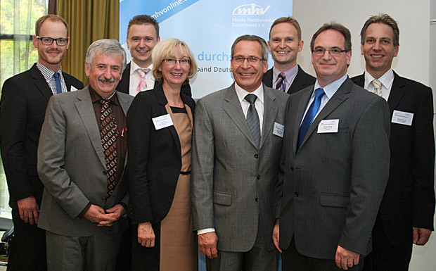 von 23: Der Vorstand des Mazda-Händlerverbandes v.l.: Lars Kaschmieder, Hans Till, Thomas Haselbach, Birgit Reis, Dieter Habermann, Geschäftsführer Markus Weller, Präsident Werner Prange und Marco Büttner.