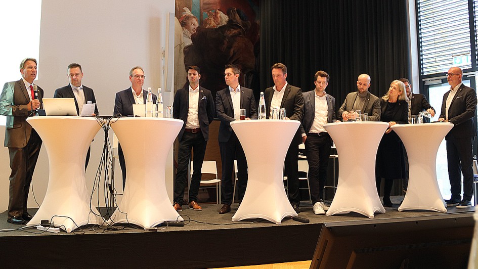 Talkrunde mit dem vollständig erschienenen Führungsteam des Importeurs (v.l.n.r.): Marko Böttcher, Thomas Haselbach und Werner Prange vom MHV, Michael Waetcke (Mazda Finance) sowie Felix Gebhart, Bernhard Kaplan, Georg Schulte, Stefan Kampa, Ines Merle, Gerd Meyer und Dino Damiano von MMD.
