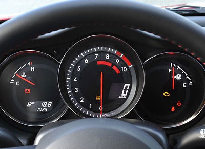 von 10: Der mittig platzierte Drehzahlmesser verfügt nun über einen variablen roten Drehzahlbereich, der abhängig von der Motortemperatur nach einem Kaltstart das empfohlene Umdrehungsmaximum anzeigt.