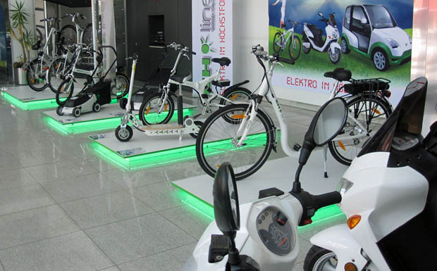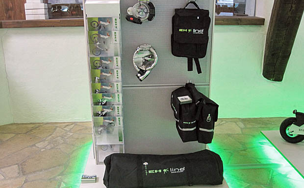 von 4: Das Startpaket für die "EH Line"-Shops in den Ausstellungsräumen umfasst u.a. zwei E-Klappräder, sieben E-Herren- und Damenräder, zwei E-Fun-Geräte, ein E-Scooter, zwei E-Rasenmäher, ein Fahrradtower (E-Ladezentrale) sowie Zubehör.