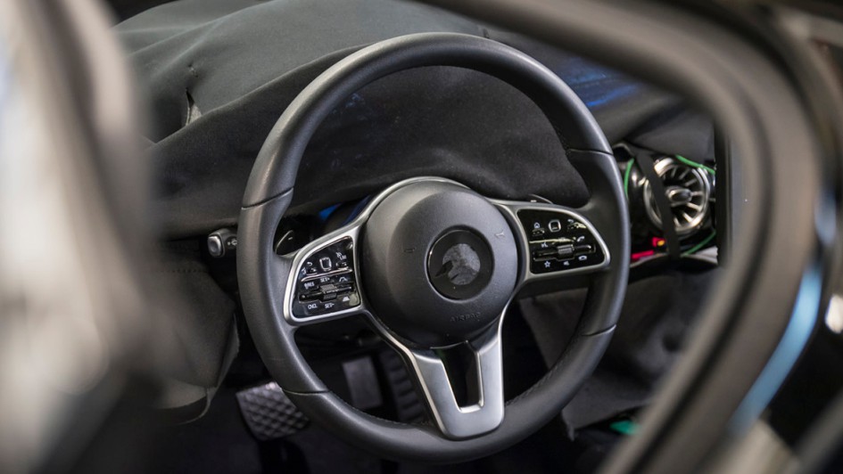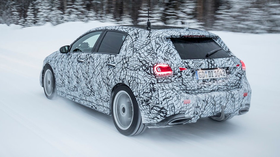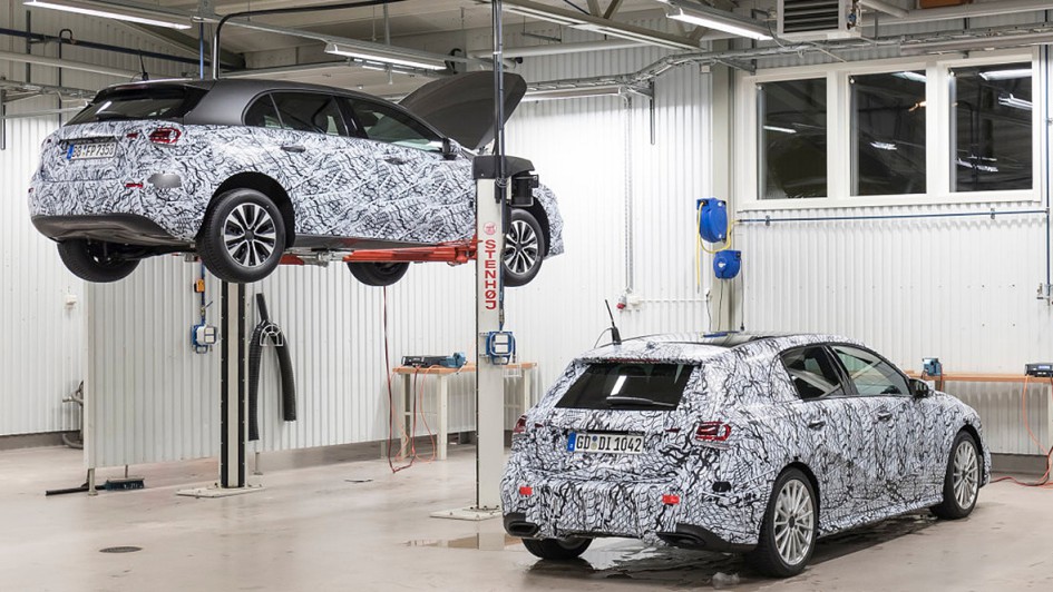 von 6: In der hell erleuchteten Werkstatthalle stehen zwei beklebte Prototypen. Die Probanden sind als Mercedes A-Klasse zu entlarven, doch Details über das Design sollen bis zur Weltpremiere Anfang Februar 2018 geheim bleiben.