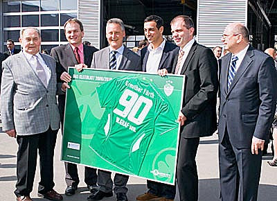 von 6: Rachid Azzouzi, Spielemanager Greuther Fürth, und Dirk Weißert, Geschäftsleitungspartner Greuther Fürth, überreichen Wilhelm Graf Senior zum 90. Geburtstag ein Ehrentrikot. Von links: Wilhelm Graf Senior, Horst Müller (Wirtschaftsreferent der Stadt Fürth), Oberbürgermeister Dr. Thomas Jung, Rachid Azzouzi, Dirk Weißert und Wilhelm Graf Junior. (Foto: Peter v. Beyer)