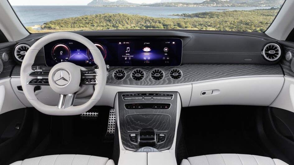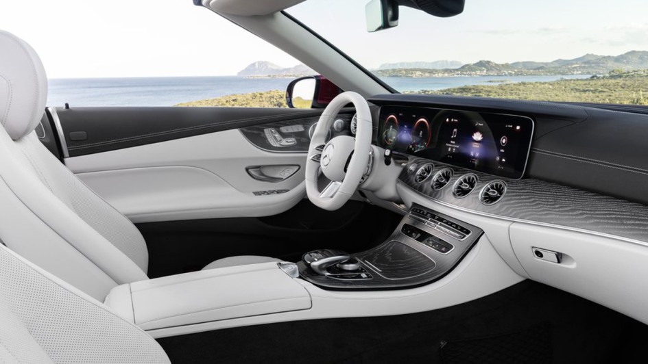 von 10: Für den Innenraum der zweitürigen E-Klasse-Modelle gibt es neue Zierteile wie offenporige Esche in Grau oder Aluminium mit Carbonschliff. Zur Serienausstattung gehört künftig ein aus zwei 10,25-Zoll-Displays bestehendes Cockpit. Das Infotainmentsystem MBUX mit Sprachbedienung und Augmented-Reality-Funktionen ist bereits im Paket enthalten.