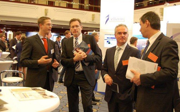 von 4: Holger Suffel (2.v.l.) und Thomas Bartmann beim Rundgang über die Infobörse, hier im Gespräch mit Christian Schumacher (Scholz Regalsysteme, l.)