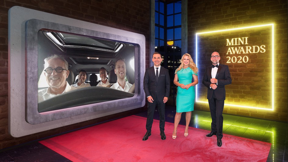von 6: Mini hat zum neunten Mal in Folge die deutschen Top-Händler geehrt. Das gesamte Führungsteam von BMW und Mini Deutschland dankte am Mittwoch den Vertriebspartnern für ihr Engagement im schwieigen Jahr 2020. Im Bild das deutsche Mini-Management mit Leiterin Ulrike von Mirbach, Vertriebschef Rüdiger Paff und Marketingleiterin Susanna Eiber. Die Moderation übernahm Barbara Schöneberger (v.l.n.r.).