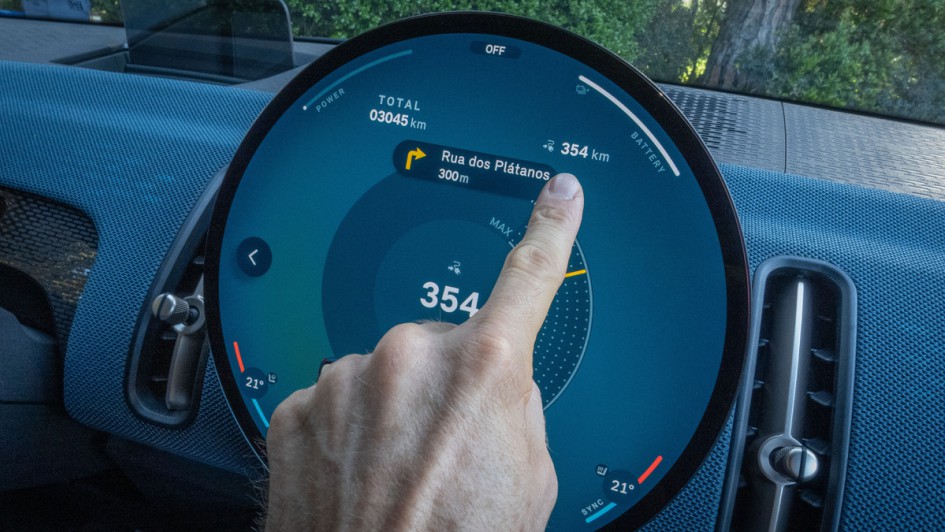 von 18: Spike wurde die Figur unten rechts im Display getauft, einen persönlichen Assistenten soll sie mimen. Verständigungsprobleme gibt es aber derzeit noch. Das Gesprochene wird – wie im Ora 03 – im Display angezeigt, verstanden wurde vom gesagten nichts, umgesetzt auch nicht. Onyria Hotel Cascais hätte dort stehen sollen und das Navi sollte die Zielführung starten.