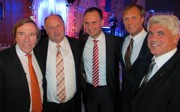 von 11: Günter Netzer und Gerhard Delling plauderten über die EM und die anstehende Saison - hier mit Helmut und Andreas Peter (MB-Vertreter u.a. Nordhausen) und Manfred Eggert (Hyundai u.a. Rügen)
