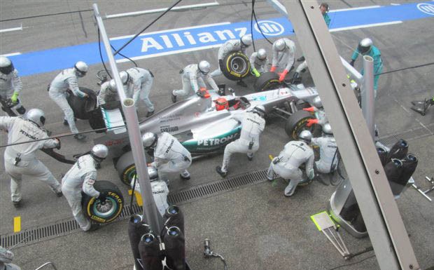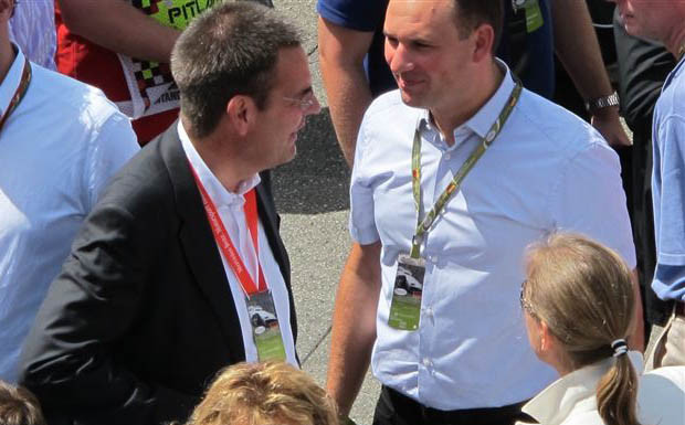 von 11: Beim Pit-Lane-Walk trifft man unter anderem auf MB-Chef Dieter Zetsche, Verkehrsminister Peter Ramsauer oder Boris Becker. Im Bil: Daniel Bartos, Vertrieb MB-Cars Deutschland, im Austausch mit Andreas Peter, MB-Vertreter Nordhausen.