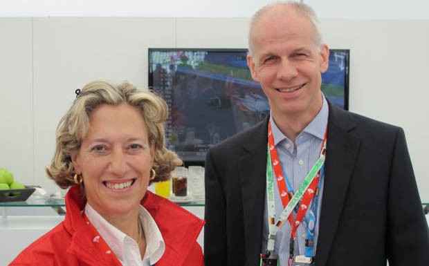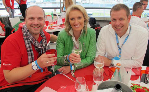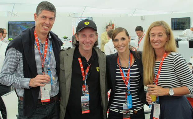 von 11: Andreas Schwarz, Vertriebschef der Rheinischen-Versicherung (l.) mit Thomas Hanswillemenke und Ehefrau und Anne Schwarz im Santander-Paddock-Club