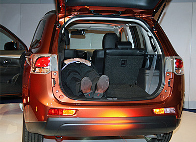 von 8: Der Mitte des Jahres in Altersteilzeit gehende Noch-Vertriebschef Horst Schollmeyer, demonstrierte die Länge der Ladefläche des neuen Outlander auf beeindruckende Art.
