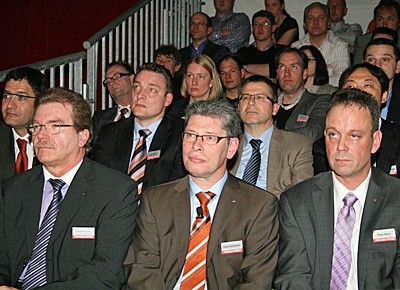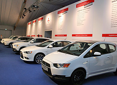 von 8: Das Führungsteam von Mitsubishi Deutschland, v.l.: Horst Schollmeyer, Harald Schallenberg und Servicechef Peter Beck. Dahinter l. Händlerverbandspräsident Guido Riemann und Händlerverbandsgeschäftsführer Georg Hilgers