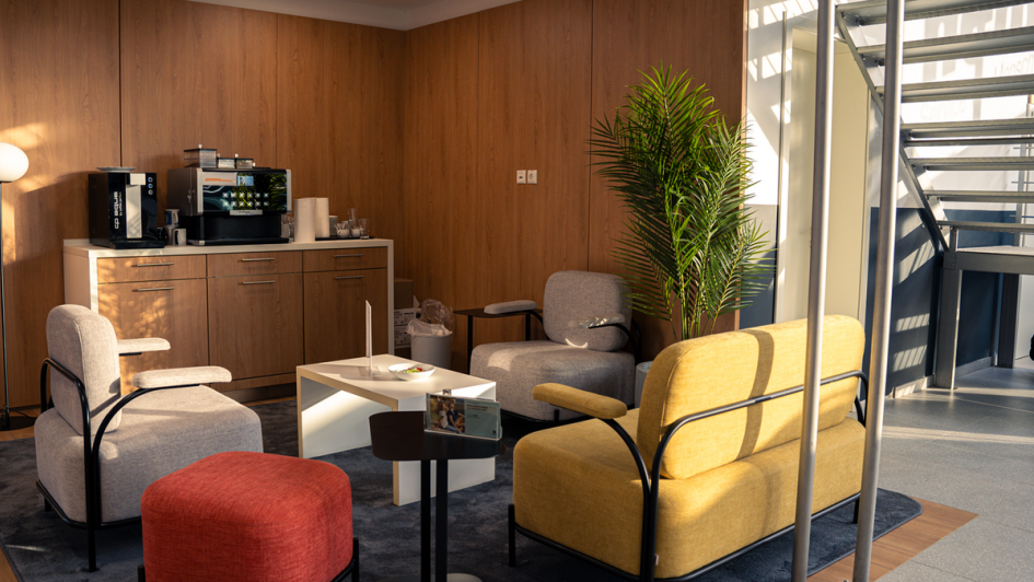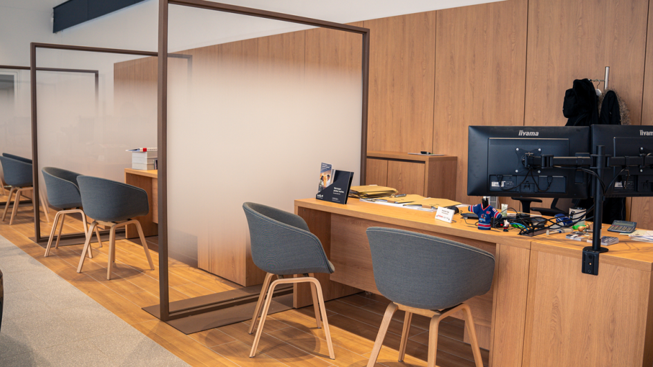 von 9: Kundengespräche werden dort nicht mehr am klassischen Verkaufs-Schreibtisch geführt, sondern in lockerer Atmosphäre an großen Smart-Screens.