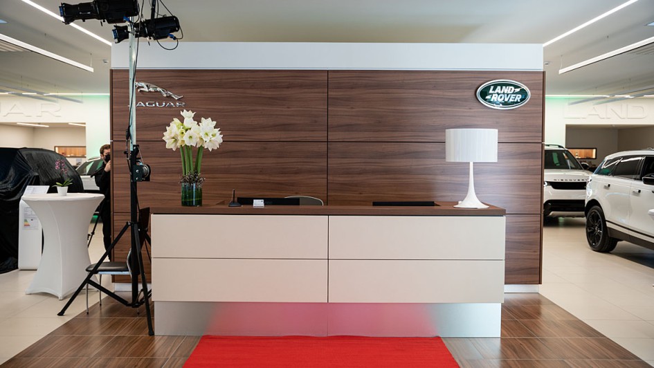 von 7: Uwe Dinnebier (Mitte) stieß mit Jaguar Land Rover Deutschland-Geschäftsführer Jan Kas van der Stelt (r.) und Netzentwickler Rainer Ohlenhard auf die Eröffnung des neuen Standortes am Ku’damm in Berlin an.