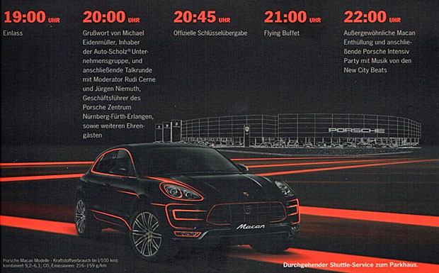von 13: Wer um 19 Uhr zur feierlichen Eröffnung den Haupteingang zur Festveranstaltung beschritt, staunte am Straßenrand über ein mit Porsche-Leinen verdecktes Fahrzeug. Was es wohl damit auf sich hat? Darunter verbarg sich aber nicht der neue Macan, sondern ein neuer, blaumetallener 5er der BMW-Niederlassung Nürnberg. Das sollte wohl der Spezialgruß eines Premiummitbewerbers zur Eröffnung werden, den BMW-spezifische Nieserlassungsgeister dort sehr früh schon am Samstagmorgen "zur Freude aller" platzierten. Ob das wohl mit dem BMW-Markengeist in der Münchener Zentrale konform geht?