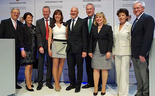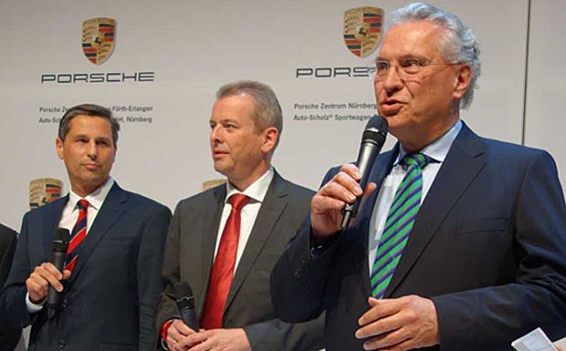 von 13: Innenminister Joachim Herrmann freute sich in der Talkrunde unter der Moderation von Rudi Cerne darüber, dass das nunmehr schönste und modernste Porschezentrum Bayerns im Frankenland steht. Wie es kein Zufall ist, dass die deutsche Automobilindustriedominanz in den Südstaaten Bayern und Baden-Württemberg angelegt ist. Nürnbergs Oberbürgermeister Ulrich Maly erläuterte im Zusammenhang mit der Stadtumlandbahn die Überlegungen zum heutigen Standort, der direkt auf dem Weg zu Nürnbergs Flughafen gelegen ist.
