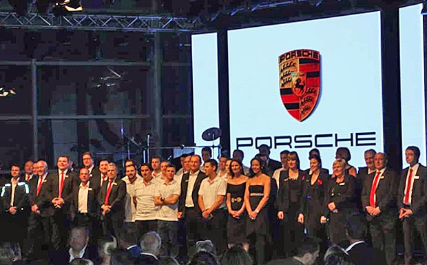 von 13: Die Macher des neuen Porsche-Standorts. Es fällt dem Geschäftsführer für die künftige betriebliche Gestaltung, Jürgen Niemuth (2.v.r.) eine besondere Aufgabe zu. Vor dem neuen Macan, der später feierlich enthüllt wurde: Zellmer (l.), Eidenmüller und der Leiter Vertrieb Vertriebsgebiet Süd, Alireza Gordi.