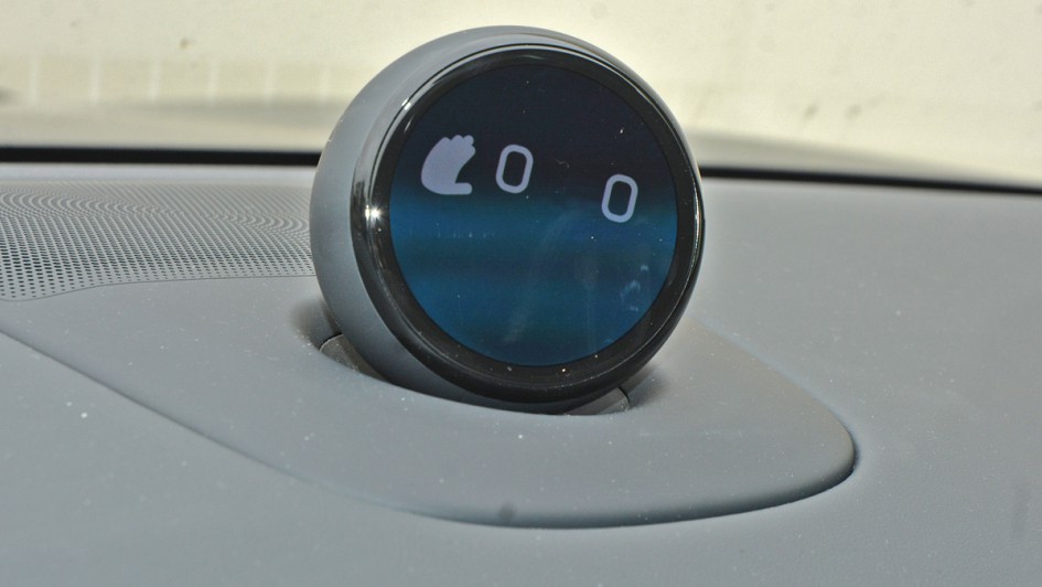 von 16: Statt zu suchen, hilft oft zu sprechen: Die KI-Assistentin Nomi funktioniert erstaunlich zuverlässig auf Sprachbefehle, prima lässt sich auf Befehl zum Beispiel die Ladeklappe öffnen. Abstellen kann man das auf dem Armaturenbrett montierte zuweilen ins Plaudern geratene Kügelchen aber auch.