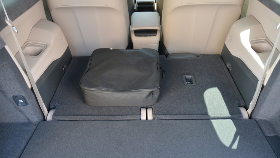 von 16: Eine ebene Fläche entsteht beim Umklappen der Lehnen. In der Tasche befindet sich das sich Ladekabel, falls man den Nio zuhause an die Wallbox klemmen will. Bei einer Ladeleistung von 11 KW dauert es freilich etliche Stunden, bis die 73,5 kWh große Batterie wieder voll ist. Eine 90 kWh-Batterie ist auch zu haben.