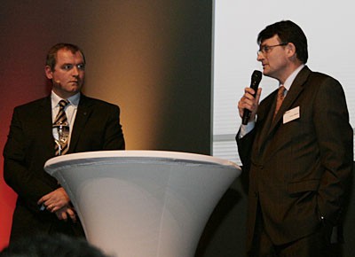 von 10: Bringen die Kunden in den Rennwagen mit Medien-Kooperationen: Langle (li.) mit PR-Chef Michael Bierdümpfl