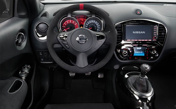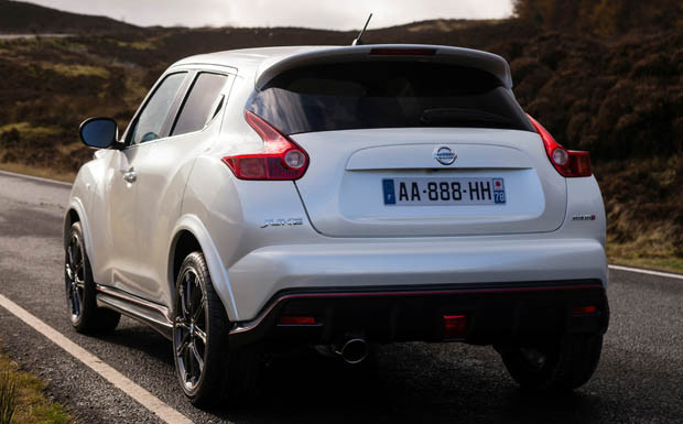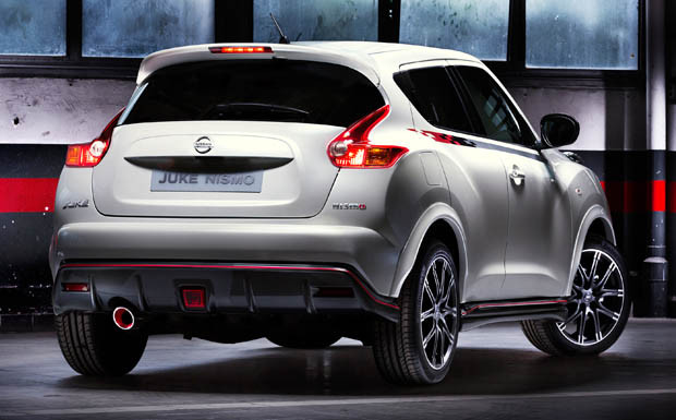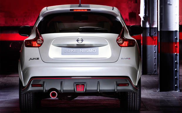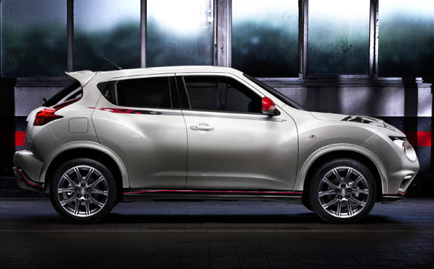 von 9: Äußerlich ist der Juke Nismo in erster Linie an seinen roten Spiegeln, dem Dachspoiler und den großen, 18-Zoll-Leichtmetallräden zu erkennen. Rote Zierstreifen sollen den Wagen zudem eindeutig als Sportversion entlarven.