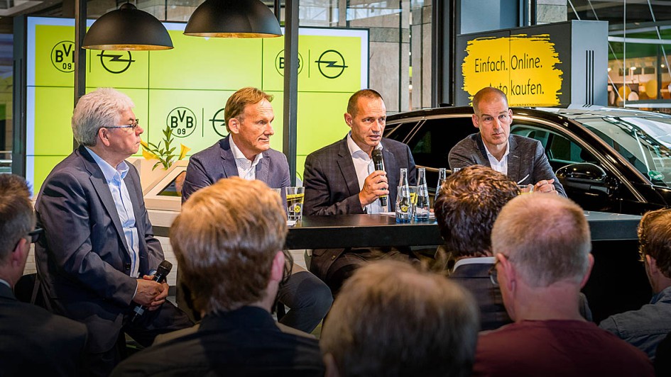 von 4: Pressekonferenz: BVB-Marketingchef Carsten Cramer, Opel Deutschland-Chef Jürgen Keller und BVB-Geschäftsführer Hans-Joachim Watzke (v. l.) beantworten bei der Eröffnung die Fragen der Journalisten.