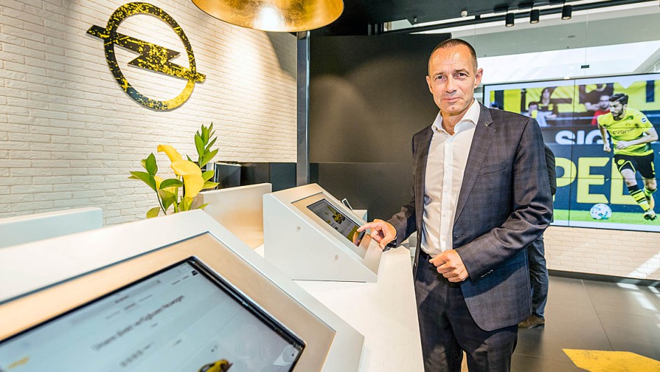 von 4: Strahlen mit dem Opel Grandland X um die Wette: BVB-Geschäftsführer Hans-Joachim Watzke, Opel Deutschland-Chef Jürgen Keller und BVB-Marketingchef Carsten Cramer (v. l.) bei der Eröffnung des Cayu-Store im Centro Oberhausen.