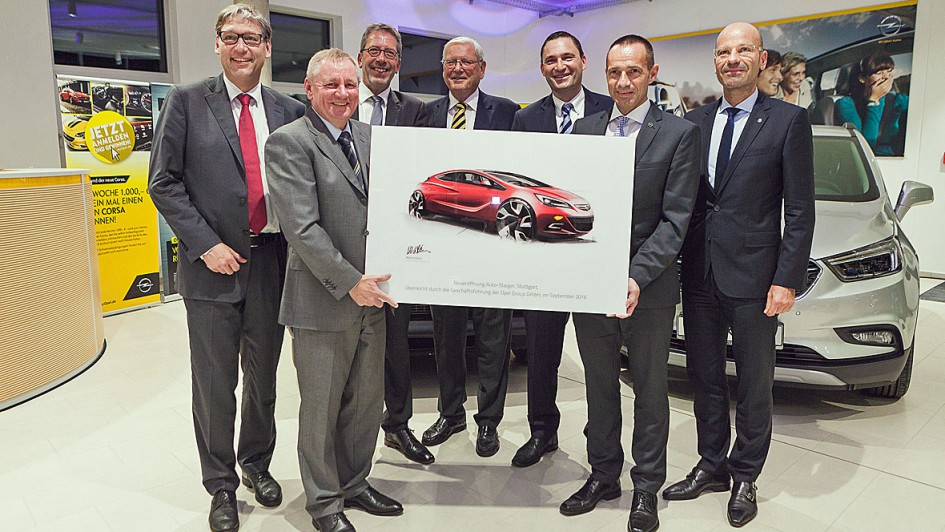 von 8: Albert C. Still, Opel-Vertriebschef Peter Christian Küspert, Marcus Stein, Albert K. Still, Roman Still, Jürgen Keller, Deutschland-Chef Opel, und Elmar Klein, Regionalleiter Region Südwest Opel.