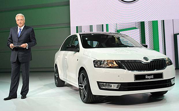 von 13: Skoda-Chef Vahland präsentiert das Bindeglied der Marke von Fabia und Octavia: den kompakten Rapid. (Foto: UnitedPictures/Auto-Reporter.NET)
