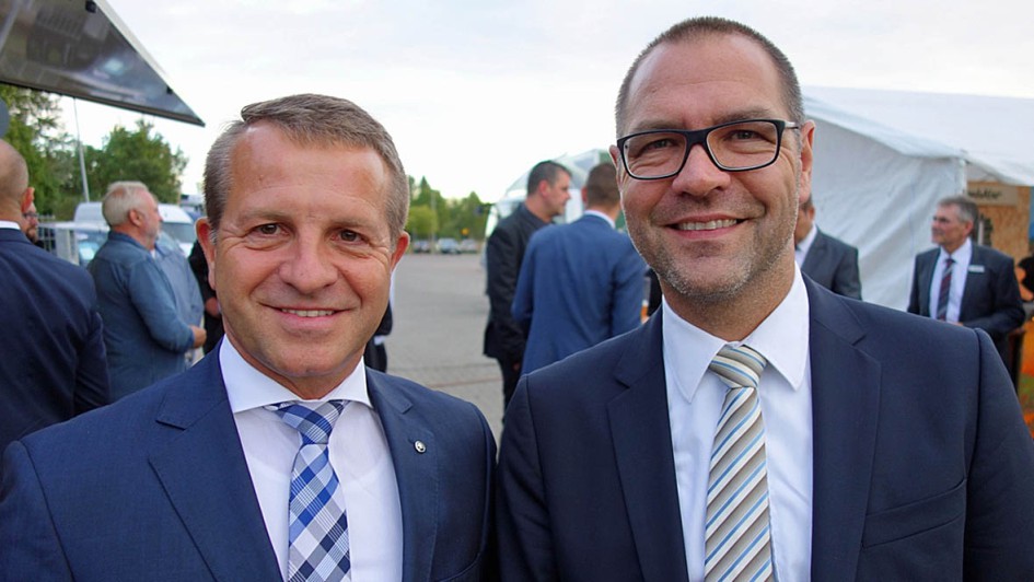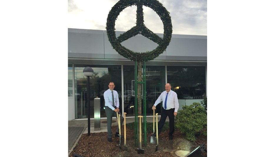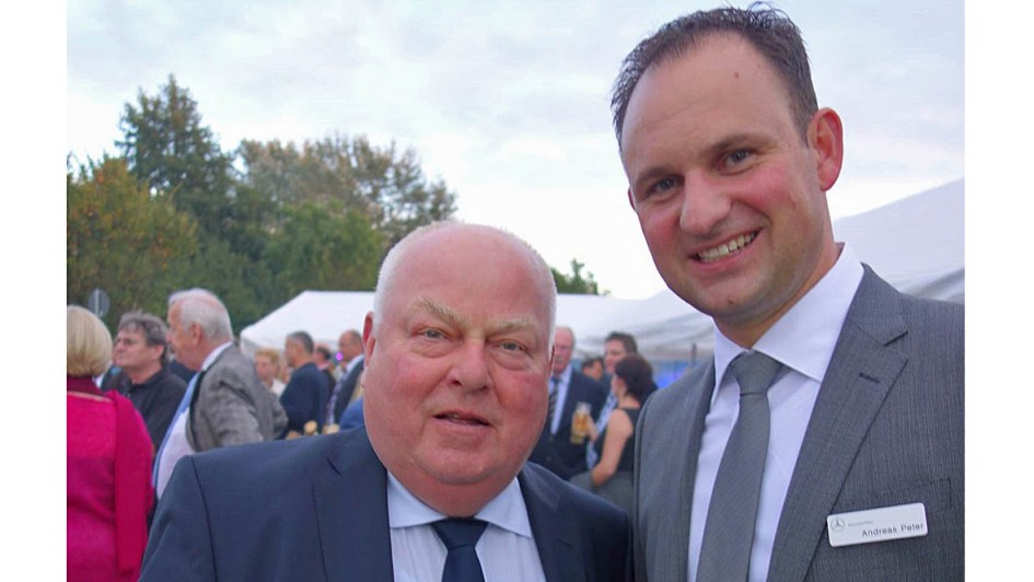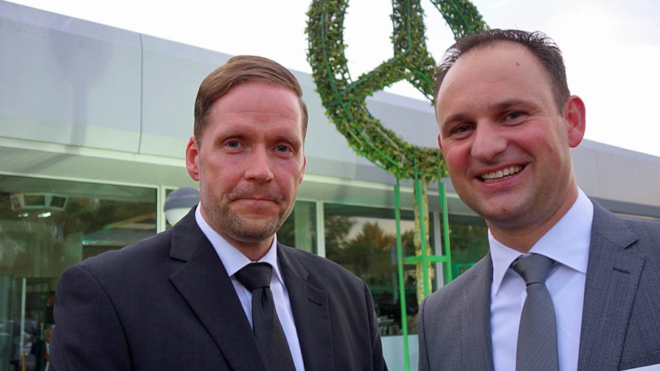 von 35: Am Haupteingang empfingen Helmut und Andres Peter die Gäste. Hier Carsten Oder (r.) Vorsitzender der Geschäftsleitung Mercedes-Benz Cars Vertrieb Deutschland (MBD). Vor dem "grünen MB-Naturstern". Nachhaltigkeit live!