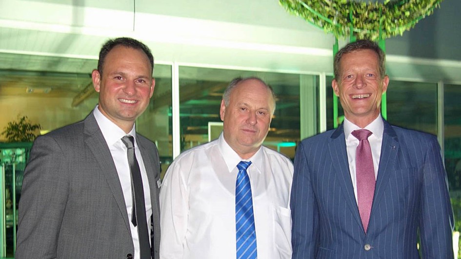 von 35: Das Beresateam übergab symbolisch die Schlüsselgewalt an die drei Generationen Peter: Helmut, Andreas und dessen Sohn Laurent. Rademacher: "Zukunft muss durch Arbeit erschlossen werden."