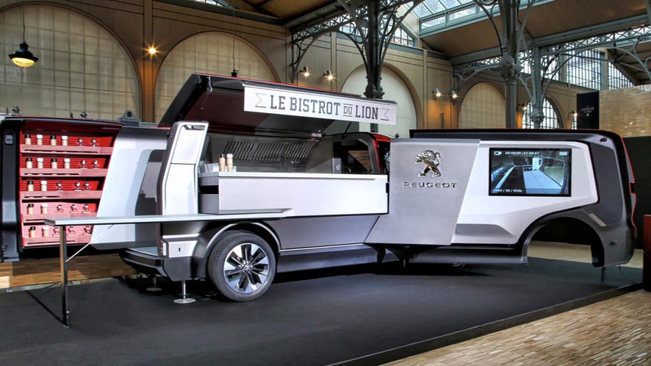 von 6: Das erste mobile Restaurant von Peugeot will nicht nur eine gewöhnliche Imbissbude sein, sondern gemeinschaftliches Essen zu einem Erlebnis machen. So kann eine der zwei Theken auch zum DJ-Pult werden.
