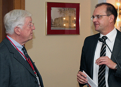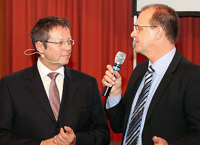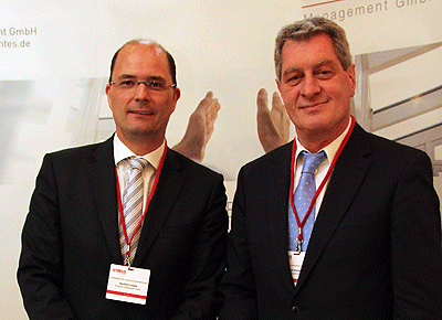 von 21: Während der Kaffeepause konnten sich die Kongressteilnehmer an den Ständen der Sponsoren informieren, z.B. bei Prudentes-Geschäftsführer Norbert Irsfeld (l.) und Manfred Weinmann, Senior Consultant.