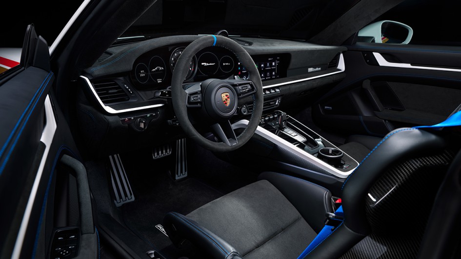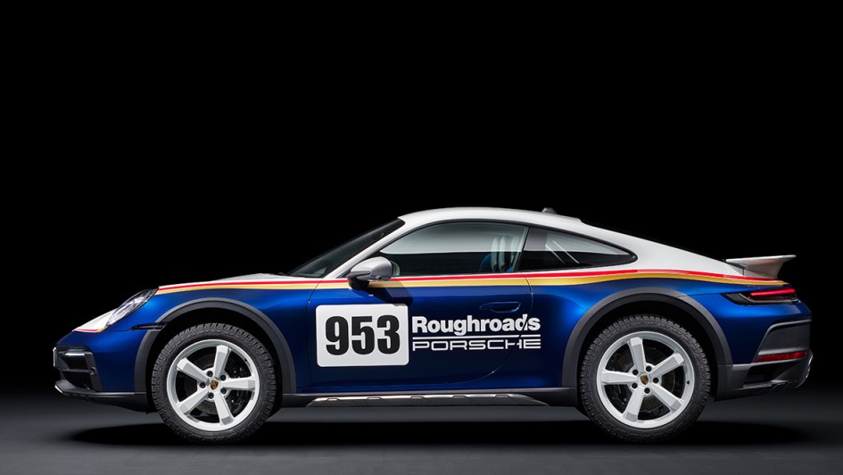 von 10: Eine Zweifarblackierung in Blau und Weiß sowie Dekorfolierung im Stil des Siegerfahrzeugs von 1984 macht den Porsche 911 Dakar zum Blickfang.