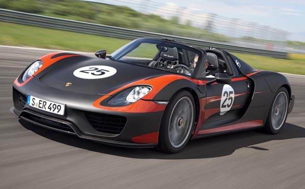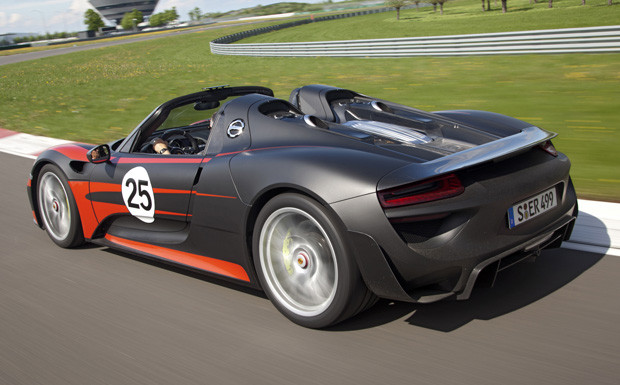 von 6: Porsche hat jetzt die Leistungswerte seines neuen Hybrid-Sportwagens 918 Spyder präzisiert: Als Hauptantriebsquelle dient ein aus dem Rennwagen RS Spyder abgeleiteter Achtzylinder, der 448 kW / 608 PS aus 4,6 Litern Hubraum mobilisiert und Drehzahlen bis zu 9.150 U/min erlaubt.