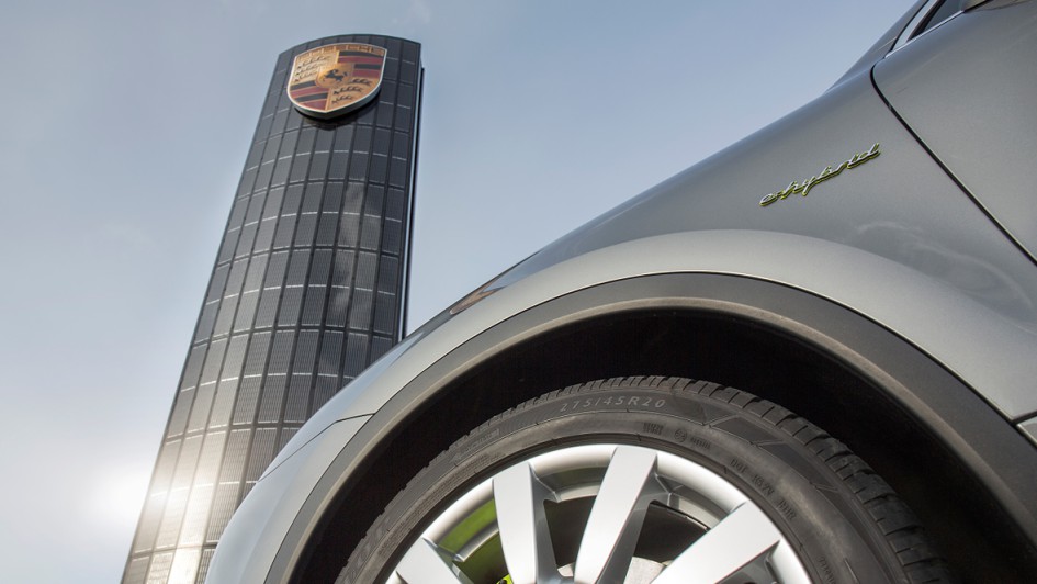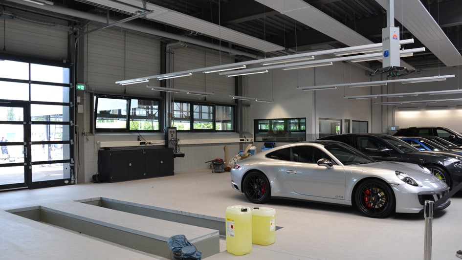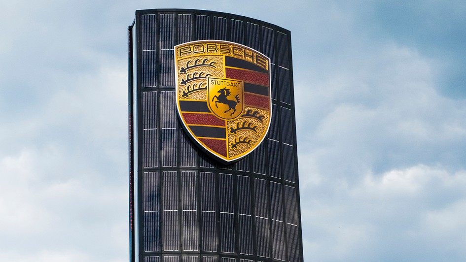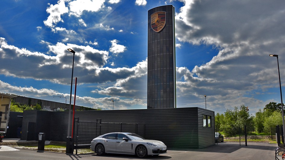 von 12: Der 800.000 Euro teure, prägnante Bau mit 162 Solarpaneelen, 7.776 Solarzellen und vier mal drei Meter hohem Porsche-Logo soll bis zu 30.000 Kilowattstunden Strom jährlich erzielen und damit den Bedarf des gesamten neuen Autohauses abdecken.