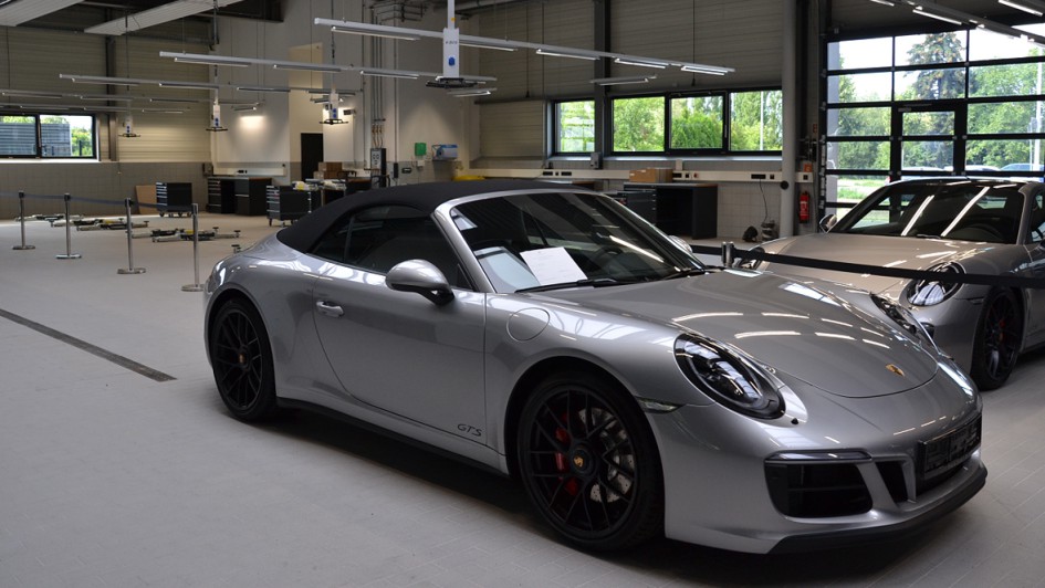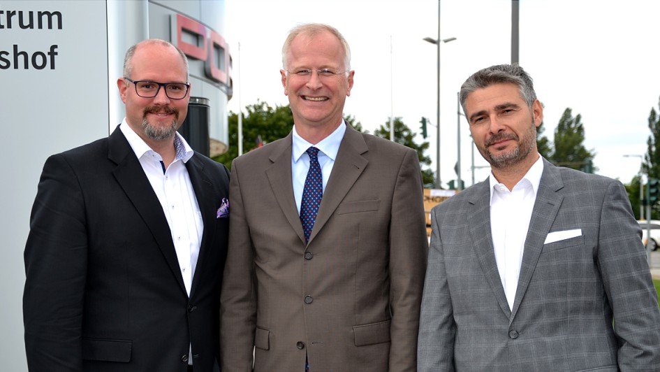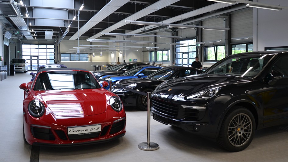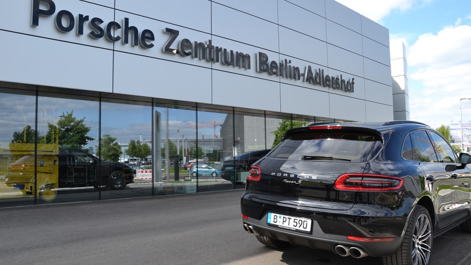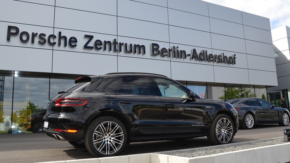 von 12: v.l.n.r.: Patrick Henkel (GF der Porsche-Niederlassungen Berlin), Jens Puttfarcken (Vorsitzender der GF Porsche Deutschland GmbH), Heinz Moreira (GF Porsche Zentrum Berlin-Adlershof)