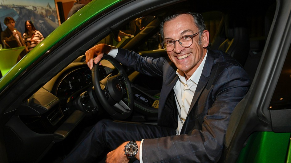 von 10: V.l.n.r. Martin Stummer (Porsche Zentrum München), Michael Peterseim (The KaDeWe Group), Alexander Pollich (Porsche Deutschland), Peter Modelhart (VGRD), Alexander Repp (Oberpollinger) sowie Franko Dorow (Porsche Zentrum München-Süd) vor dem Taycan Turbo S in Mambagrün-Metallic.