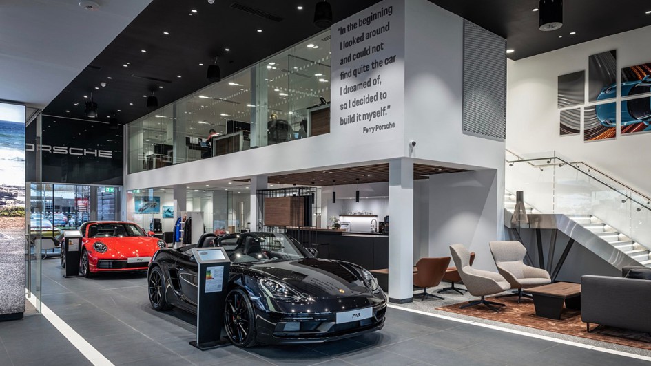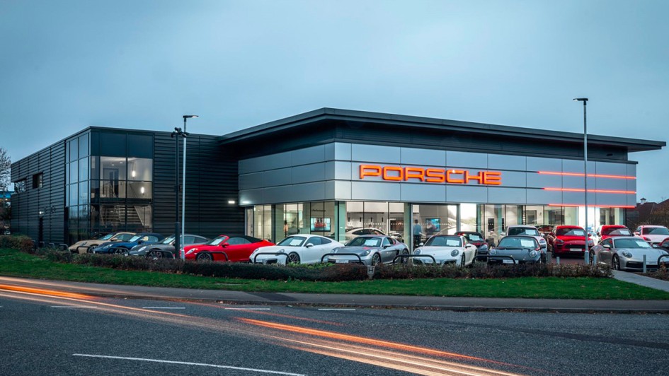 von 9: Porsche Zentrum Satellit: Wenn ein Vertriebspartner zusätzliche Kapazitäten benötigt, das Marktgebiet aber zu klein für ein weiteres Porsche Zentrum ist, ist diese kompaktere Lösung eine Erweiterungsmöglichkeit. Vom klassischen Vollfunktionsbetrieb unterscheidet sich der Standort durch das einstöckige Gebäude mit rechteckigem Grundriss und den rund 400 Quadratmeter großen Showroom. Erster Porsche Zentrum Satellit in Europa ist der im Herbst 2021 eröffnete Standort im britischen York, der ..