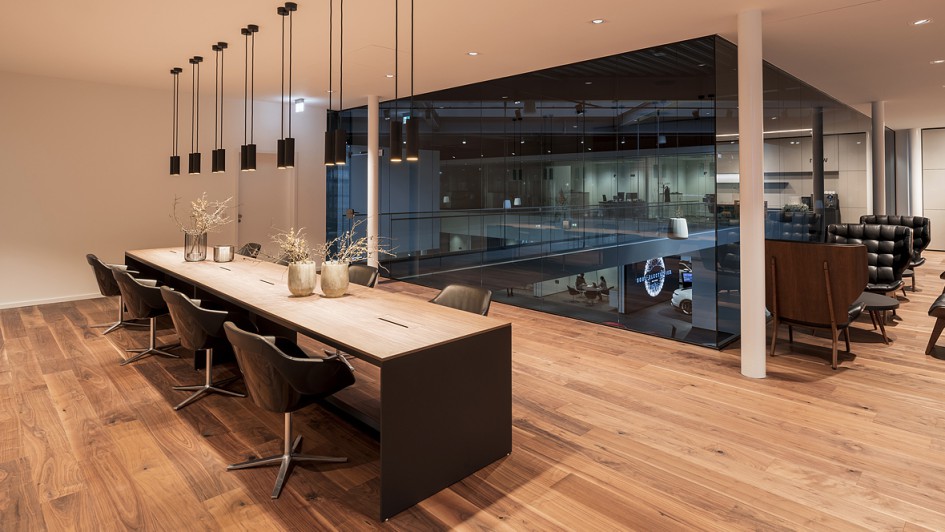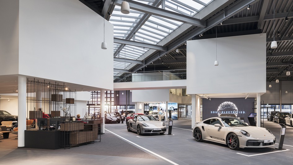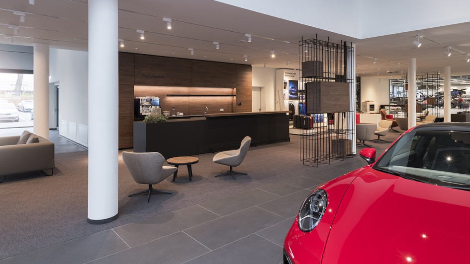 von 8: Das neue Retail-Konzept "Destination Porsche" wurde erstmals in einem neu gebauten Porsche Zentrum umgesetzt. Die Hülpert Gruppe investierte 19 Millionen Euro in das Leuchtturmprojekt.