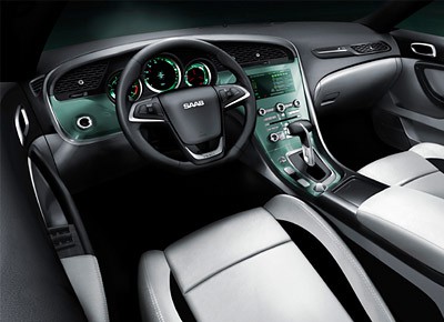 von 7: In der auf den Fahrer zugeschnittenen "Kommandozentrale" sind u.a. ein Starterknopf, die Kontrollinstrumente für das Infotainmentsystem sowie ein Tachometer im Stil eines Höhenmessers untergebracht. Das der Form eines Flugzeugs ähnelnde Lenkrad soll das Aviatik-Erbe von Saab betonen.