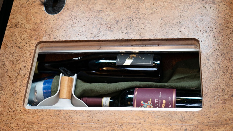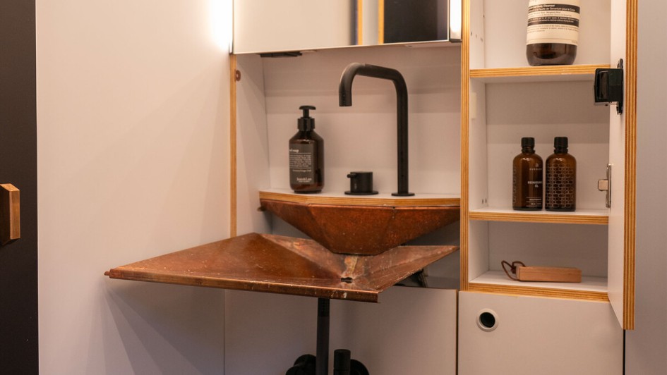 von 8: Decken und Böden sind von innen mit Sprühkork beschichtet, statt auf Plastik läuft man bei auf Korkparkett, die Schränke sind aus Echtholz gebaut und das Waschbecken aus Kupfer statt aus Kunststoff.