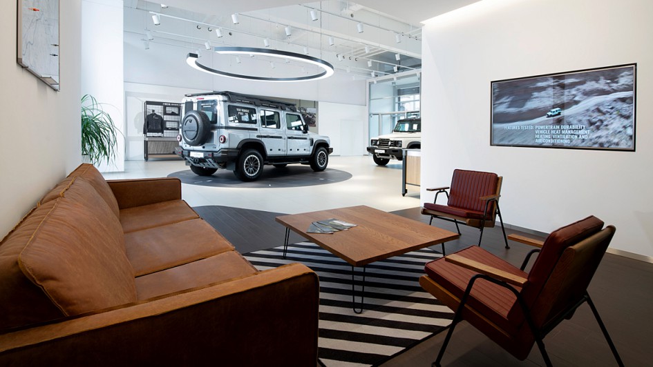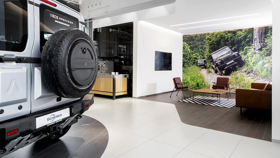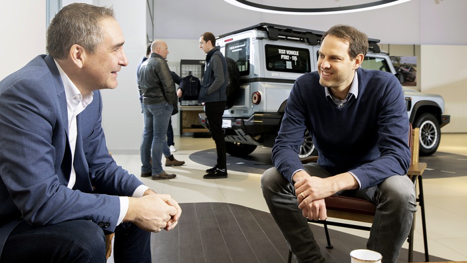 von 5: Unternehmenschef Christian Scherer (l.) und Leif Scholz haben mit dem Ineos Grenadier viel vor. Im Hintergrund: Vertreter der Innenausbau-Firmen Vizona und Principle im Gespräch mit Matt Robinson, der bei Ineos unter anderem den Bereich Corporate Identity betreut.