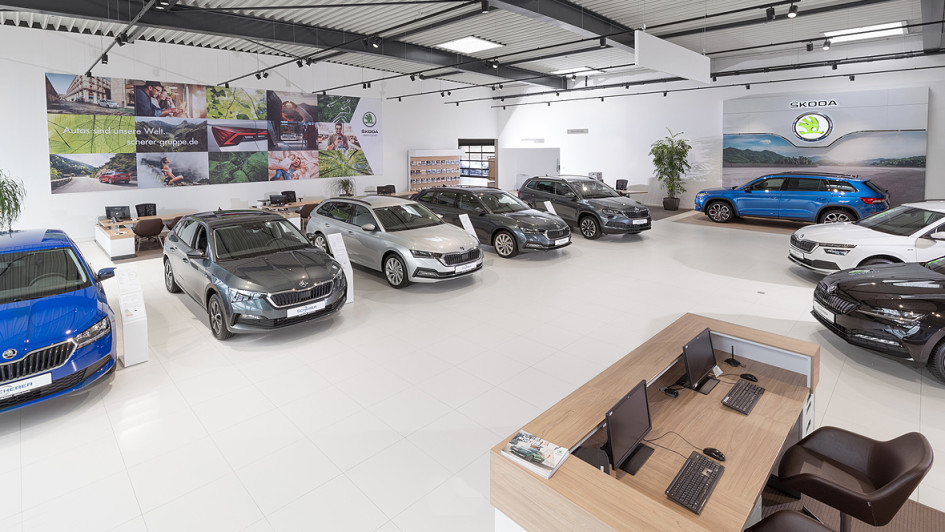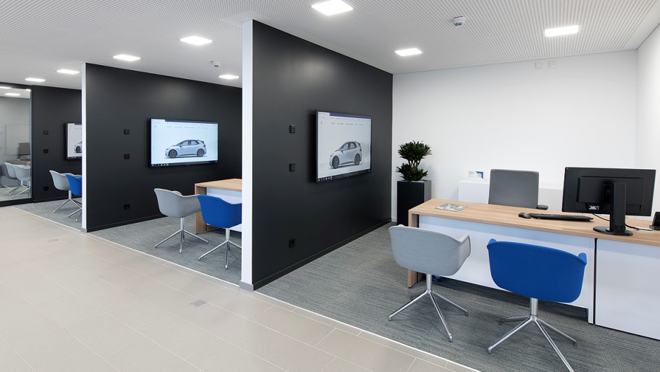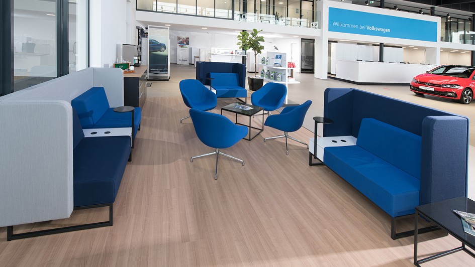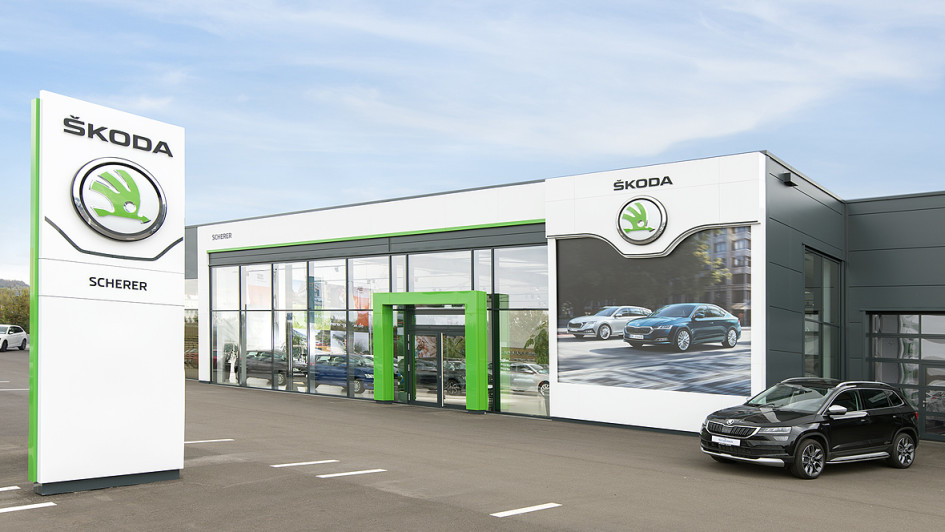 von 10: Der neue VW-Showroom der Scherer Gruppe in Bingen. Der Betrieb soll eine hohe Energie-Effizienz aufweisen. Das nachhaltige Konzept unterstreicht das Unternehmen mit einer eigens konstruierten Außenwand mit Holzlamellen-Verkleidung.